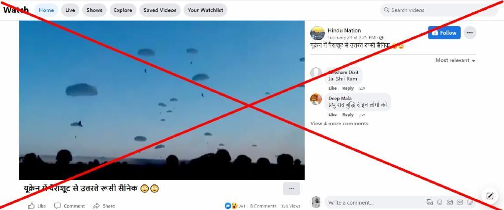 रूस के राष्ट्रपति व्लादिमीर पुतिन की 24 फ़रवरी, 2022 को यूक्रेन पर हमले के आदेश के बाद ही दुनिया भर में सोशल मीडिया पर यूज़र्स एक वीडियो को शेयर करने लगे. वीडियो में सैनिकों की एक टुकड़ी को पैराशूट के ज़रिये नीचे उतरते दिखाया गया है जिसके साथ दावा किया जा रहा है कि रूसी सैनिक हमला करने के लिए यूक्रेन में लैंड कर रहे हैं. ये दावा ग़लत है. ये वीडियो लगभग 2014 के समय पोस्ट किया गया था जब पैराट्रूपर्स की एक टुकड़ी ने रूस के अंदर एक बड़े सैन्य अभ्यास में भाग लिया था. इसकी काफ़ी व्यापक स्तर पर रिपोर्टिंग भी हुई थी.