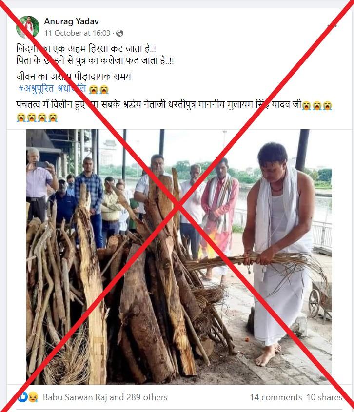 लोगों ने तस्वीर शेयर करते हुए दावा किया कि इसमें यादव के बेटे और उत्तर प्रदेश के पूर्व मुख्यमंत्री अखिलेश यादव अपने पिता को मुखाग्नि दे रहे हैं.