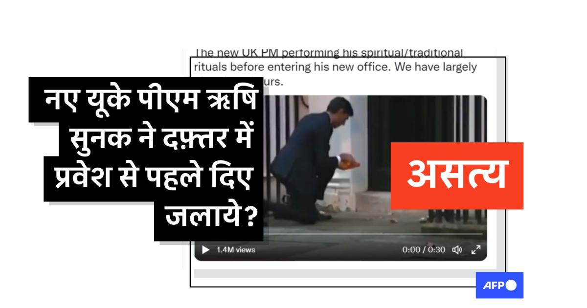 ऋषि सुनक का एक पुराना वीडियो शेयर करते हुए दावा किया जा रहा है कि प्रधानमंत्री बनते ही उन्होंने कार्यालय में प्रवेश से पहले हिन्दू धर्म के रीतियों के अनुसार दिए जलाये. लाखों बार देखा जा चुका ये वीडियो असल में 2020 का है. इसमें तत्कालीन चांसलर ऋषि सुनक लंदन में अपने आधिकारिक आवास के बाहर दिवाली के समय दिए जला रहे थे.