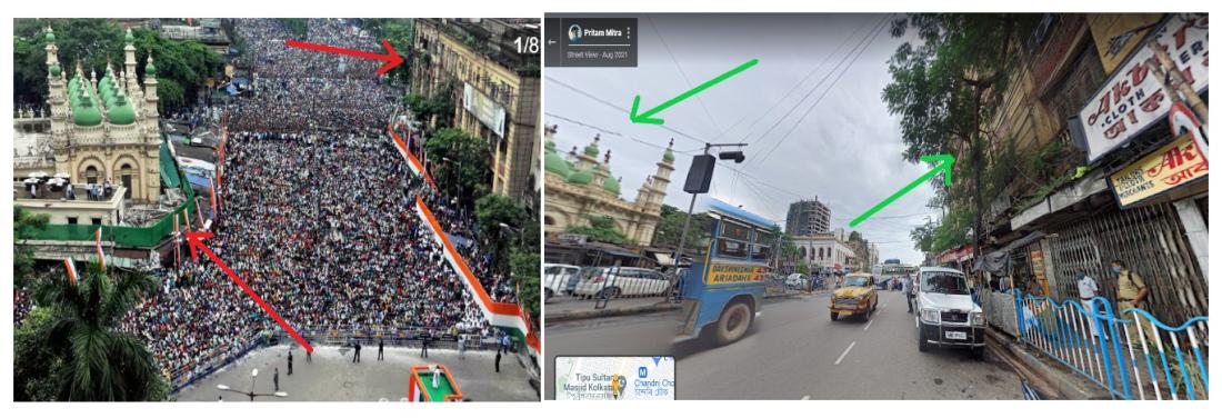 नीचे अभिषेक बनर्जी द्वारा शेयर की गयी तस्वीर (बाएं) और गूगल मैप्स के स्क्रीनशॉट (दाएं) के बीच तुलना में मिलते-जुलते निर्माण देखे जा सकते हैं:
