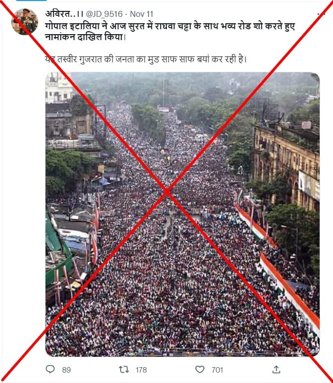 लोगों की भारी भीड़ दिखाती एक तस्वीर फ़ेसबुक और ट्विटर पर इस दावे से वायरल है कि ये गुजरात में चुनाव से पूर्व आम आदमी पार्टी के हालिया रोड शो की तस्वीर है. असल में ये तस्वीर पश्चिम बंगाल में आयोजित शहीद दिवस की है जिसे 2017 में कोलकाता में खींचा गया था.