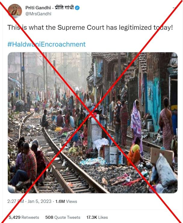भाजपा सदस्य प्रीति गांधी ने 5 जनवरी को एक तस्वीर ट्वीट करते हुए लिखा, “सुप्रीम कोर्ट ने आज इसे वैधता दी है #हल्द्वानीअतिक्रमण.” मालूम हो की उनके पांच लाख से ज़्यादा ट्विटर फ़ॉलोवर्स हैं.
