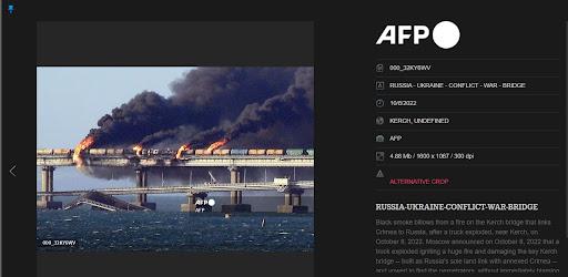 इसके कैप्शन में लिखा है, “शनिवार 8 अक्टूबर, 2022 को केर्च के पास एक ट्रक में विस्फोट के बाद क्रीमिया और रूस को जोड़ने वाले केर्च पुल पर काला धुआं निकलता हुआ. मॉस्को ने बयान दिया कि रूस और क्रीमिया को जोड़ने वाले इकलौते ज़मीनी रास्ते को ट्रक में विस्फोट और भयंकर आग के बाद काफ़ी नुकसान हुआ.”