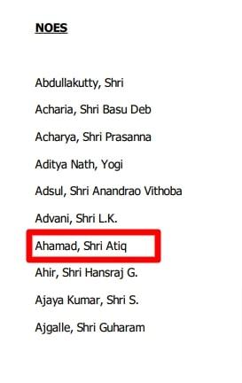 नीचे लोकसभा के दस्तावेज़ का स्क्रीनशॉट है जिसमें पेज नं. 112 पर अतीक अहमद का नाम ‘Noes’ यानी ‘नहीं’ वाली सूची में है.