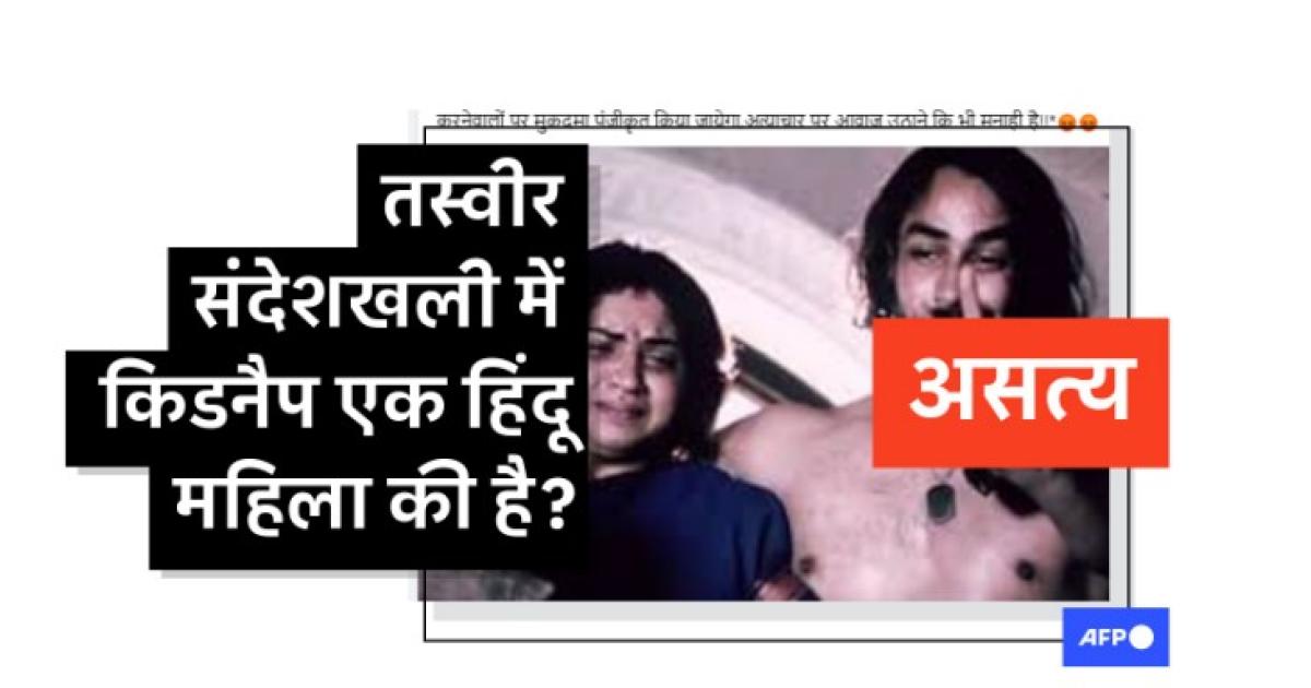 पोस्ट का कैप्शन है, "सन्देशखाली-पश्चिम बंगाल. टीएमसी के गुण्डों द्वारा उठाई गई एक हिन्दू महिला. यह गुण्डा जेहादी विक्ट्री का चिह्न दिखा रहा है. ममता बनर्जी ने पश्चिम बंगाल को पाकिस्तान बनाने में कोई कसर नहीं छोड़ी है. टीएमसी हिन्दुओं पर अत्याचार कर रहे हैं किसी कि बहन बेटी बहु सुरक्षित नहीं."
