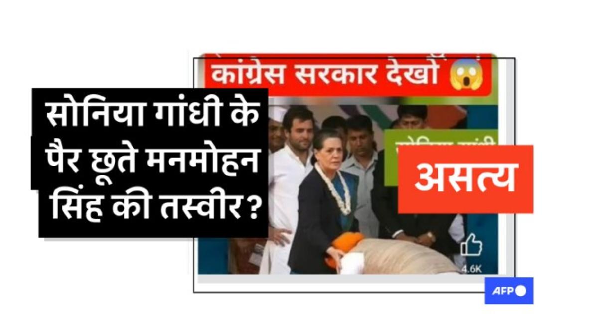 तस्वीर में भगवा रंग की पगड़ी पहने एक व्यक्ति कांग्रेस पार्टी की पूर्व प्रमुख सोनिया गांधी के सामने झुका है और ऐसा प्रतीत होता है कि वह उनके पैर छू रहा है.