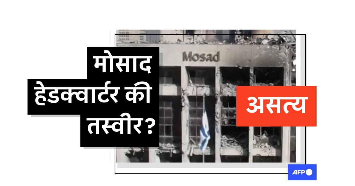 तस्वीर में दिख रही इमारत में "Mosad" शब्द है, लेकिन तेल अवीव स्थित इंटेलिजेंस और स्पेशल ऑपरेशन संस्थान "Mossad" के नाम की अंग्रेज़ी स्पेलिंग अलग है (आर्काइव्ड लिंक).