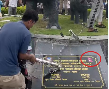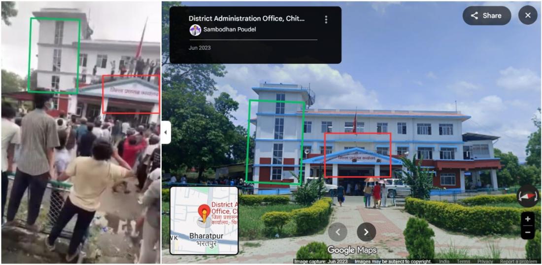 क्लिप को ध्यान से देखने पर पता चलता है कि क्षतिग्रस्त पट्टिका पर नेपाल का झंडा लगा हुआ है, जबकि पट्टिका और इमारत दोनों पर नेपाली में "जिल्ला प्रशासन कार्यालय चितवन" लिखा हुआ है (आर्काइव्ड लिंक).
