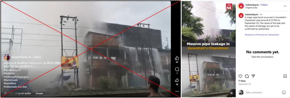 गूगल रिवर्स इमेज सर्च से पता चला कि यही वीडियो मीडिया आउटलेट इंडिया टुडे नॉर्थ ईस्ट ने सितंबर 20, 2025 को फ़ेसबुक पर पोस्ट किया था जिसके कैप्शन में इसे गुवाहाटी के चांदमारी इलाके में उस दिन पानी के पाइपलाइन फटने की घटना बताया गया है (आर्काइव्ड लिंक).