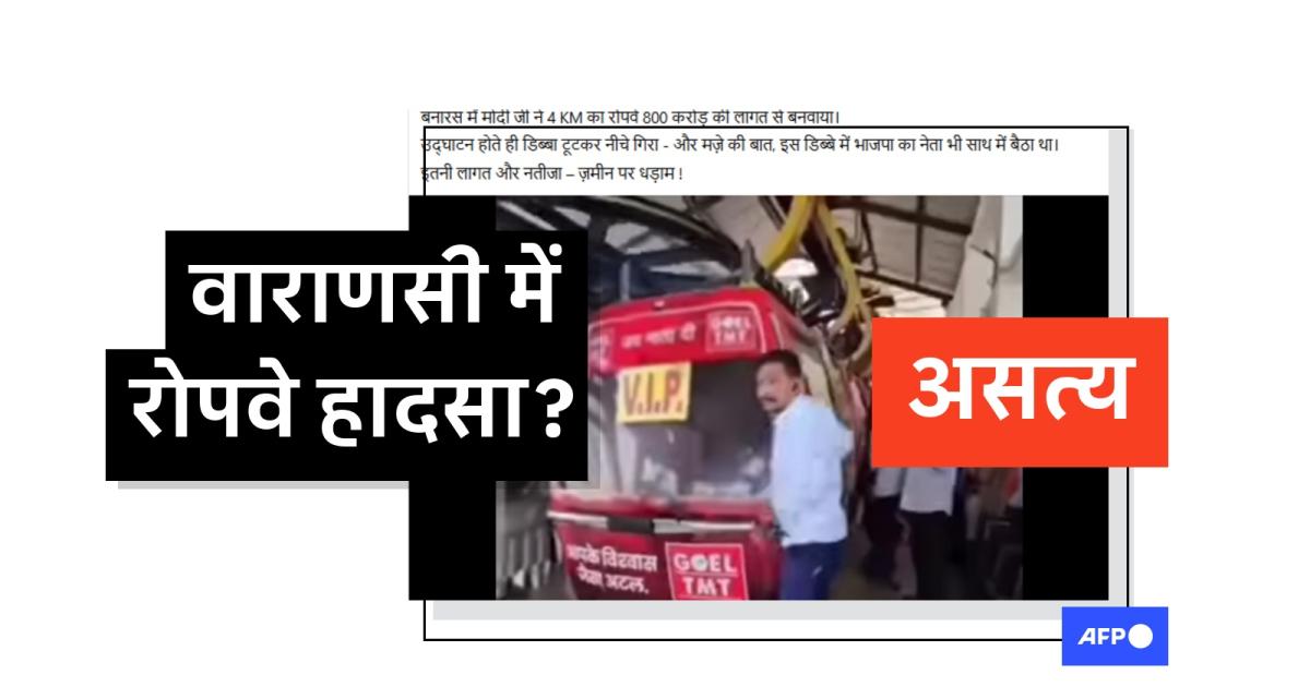 प्रधानमंत्री नरेंद्र मोदी के संसदीय क्षेत्र वाराणसी में भारत की पहली शहरी रोपवे सेवा का ट्रायल रन अक्टूबर में शुरू हुआ. इसी बीच सोशल मीडिया पर एक वीडियो शेयर करते हुए दावा किया गया कि पहली यात्रा के दौरान ही केबल कार दुर्घटनाग्रस्त हो गई. लेकिन वीडियो में दिखाए गए कार्यक्रम को कवर करने वाले पत्रकार ने एएफ़पी को बताया कि वायरल क्लिप छत्तीसगढ़ में अप्रैल में हुई एक दुर्घटना की है.