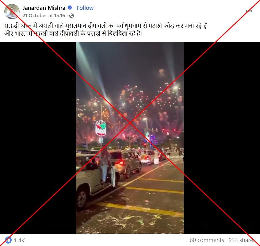 फ़ेसबुक पर अक्टूबर 21, 2025 को शेयर किए गए एक वीडियो का कैप्शन है, "सऊदी अरब में असली वाले मुसलमान दीपावली का पर्व धूमधाम से पटाखे फोड़ कर मना रहे हैं और भारत में नकली वाले दीपावली के पटाखे से बिलबिला रहे हैं."