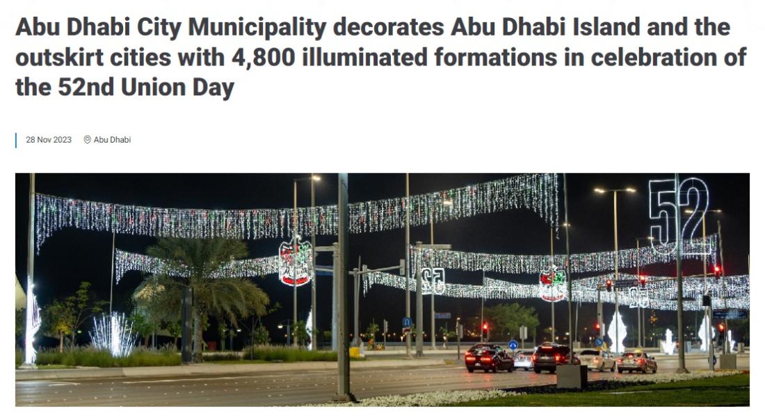 इसके बाद कीवर्ड सर्च से दिसंबर 2, 2023 को संयुक्त अरब अमीरात के 52वें यूनियन डे के उपलक्ष्य पर अबू धाबी नगर पालिका द्वारा सजावटी वस्तुओं की स्थापना के बारे में एक स्टेटमेंट मिला (आर्काइव्ड लिंक).
