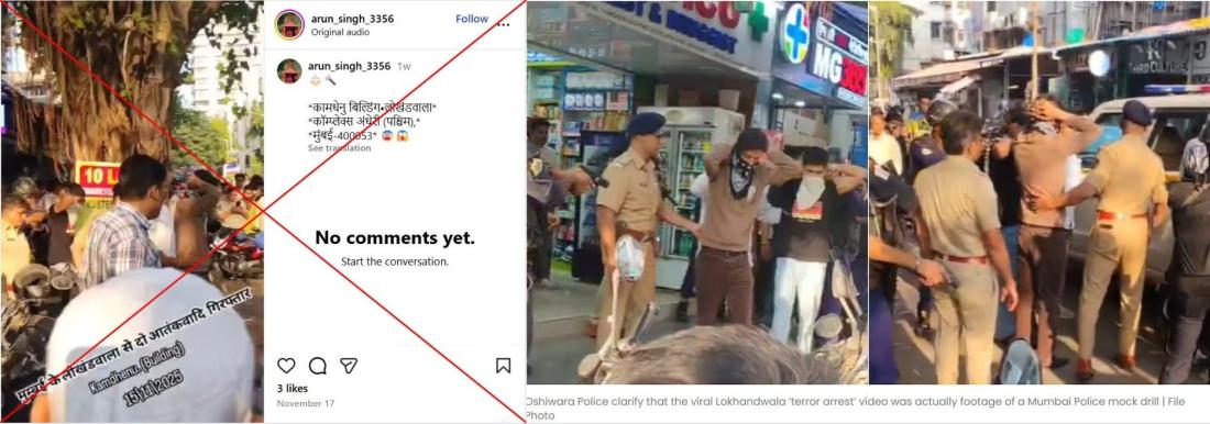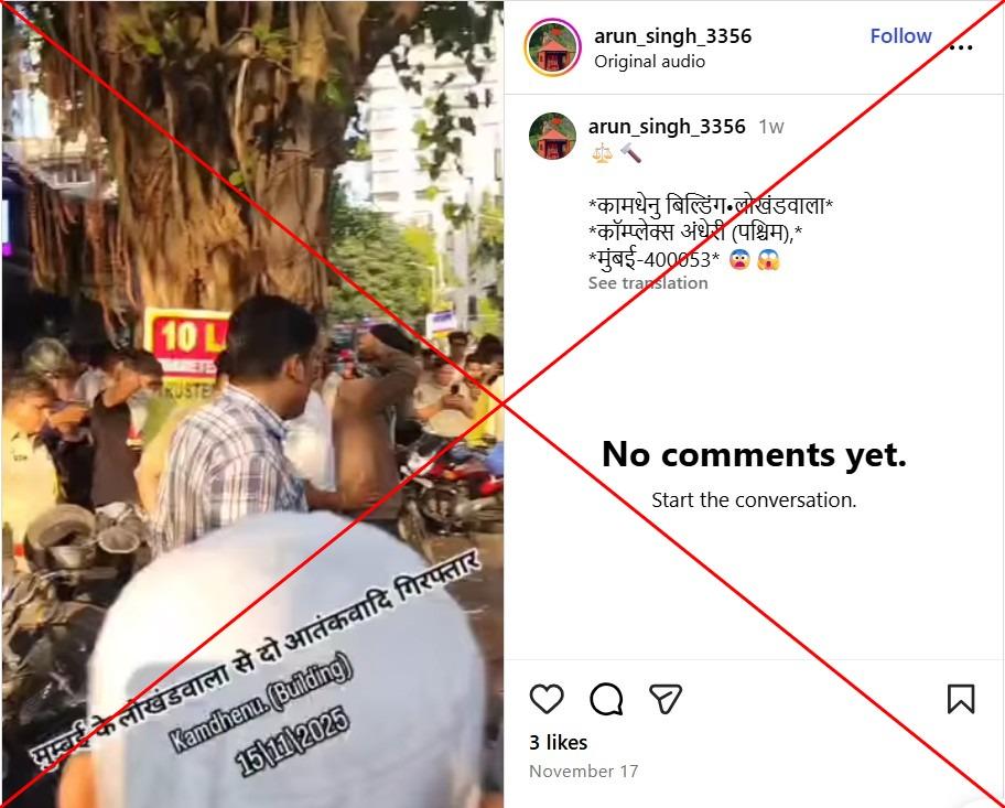 एक यूज़र ने 17 नवंबर 2025 को इंस्टाग्राम पर वीडियो शेयर की जिसमें कुछ पुलिसकर्मी दो लोगों को हाथ सिर के पीछे रखवाकर एक गाड़ी की ओर ले जाते दिख रहे हैं. वीडियो के ऊपर हिंदी में लिखा है: "मुंबई के लोखंडवाला से दो आतंकवादी गिरफ्तार। कमधेनु बिल्डिंग 15/11/2025."
