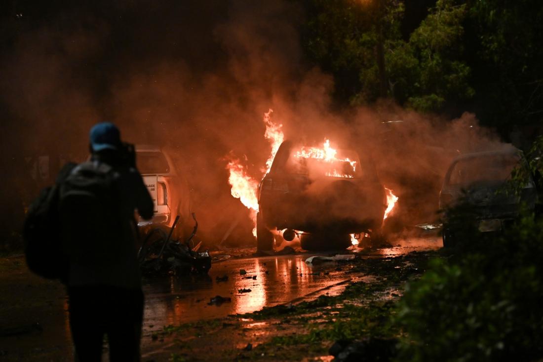 गलत दावे से शेयर किए गए वीडियो में दिख रहे जलते वाहनों में से एक को विस्फोट के बाद की एएफ़पी तस्वीरों में भी देखा जा सकता है.