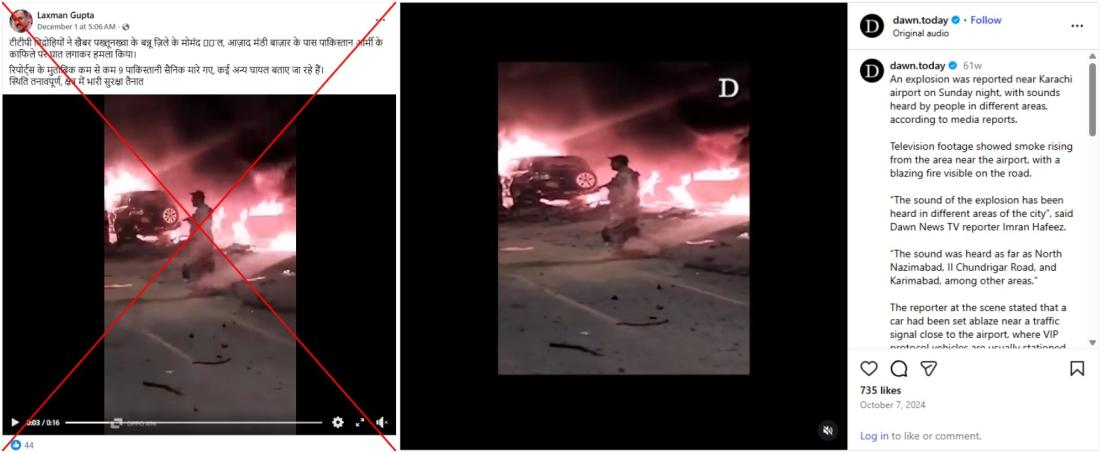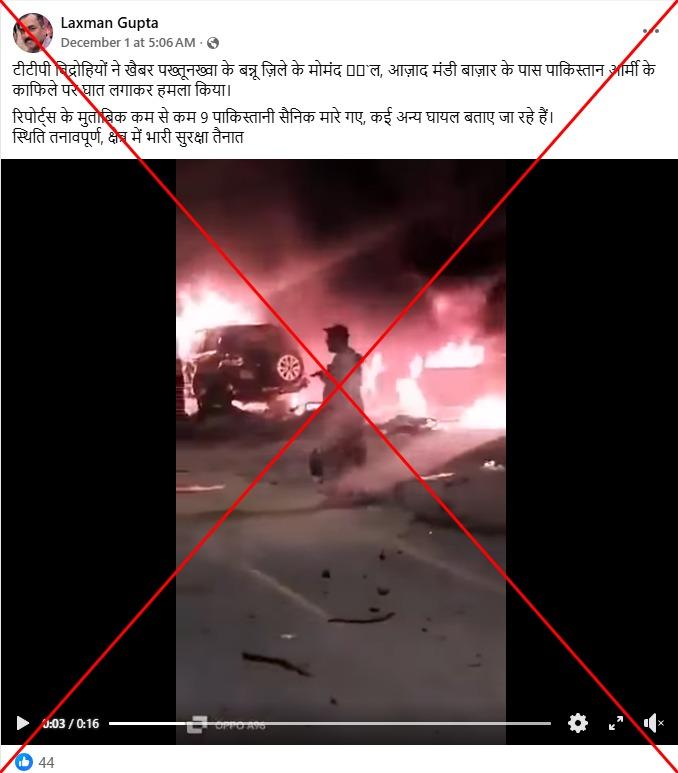 अक्टूबर में हुए युद्धविराम समझौते के बावजूद सीमा पर बढ़ते संघर्ष के बाद पाकिस्तान और अफ़ग़ानिस्तान के बीच तनाव अभी भी जारी है, मगर सोशल मीडिया पर आग की लपटों में घिरे वाहनों का वीडियो, जैसा दावा किया गया है, सीमा पास तालिबान द्वारा पाकिस्तानी सेना पर किये हमले को नहीं दिखाता. यह वीडियो अक्टूबर 2024 के न्यूज़ रिपोर्ट्स में कराची हवाई अड्डे के पास हुए विस्फोट के दौरान शेयर किया गया था जिसमें दो चीनी नागरिक मारे गए थे.