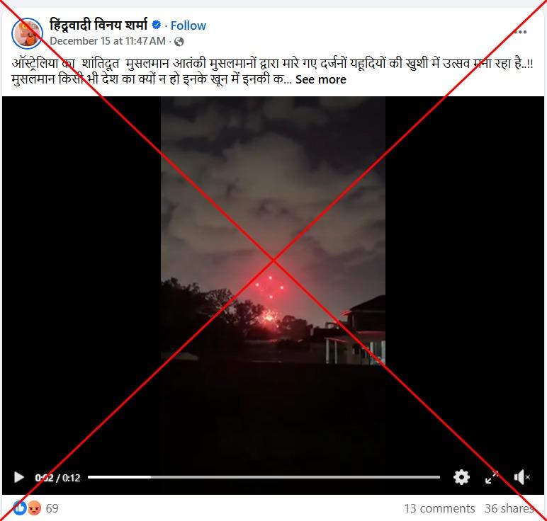 ऑस्ट्रेलिया में सिडनी के बॉन्डी बीच पर हमलावरों द्वारा गोलीबारी में 15 लोगों की हत्या के कुछ घंटों बाद क्रिसमस की आतिशबाज़ी का एक वीडियो सोशल मीडिया पर इस दावे से शेयर किया गया कि ये मुस्लिम समुदाय को बॉन्डी में हुए खुनी हमले का जश्न मनाते दिखाता है. हालांकि एक सामुदायिक समूह ने एएफ़पी को बताया कि यह आतिशबाज़ी उनके सालाना क्रिसमस कार्यक्रम का हिस्सा थी, जिसकी प्लानिंग कई महीने पहले कर दी गई थी और इसका बॉन्डी में हुई गोलीबारी से "किसी भी तरह का कोई संबंध नहीं" है.