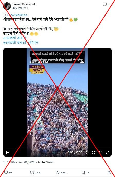 X पर एक यूज़र ने 20 दिसंबर को वीडियो शेयर करते हुए कैप्शन लिखा, जिसका एक हिस्सा है, "अरावली को बचाने के लिए लाखों की भीड़, संगठन में ही शक्ति है."
