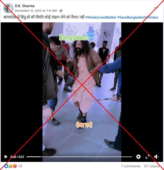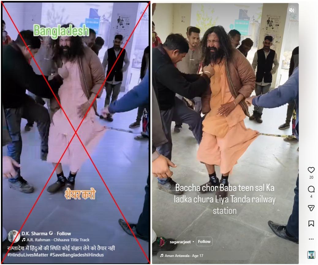 मीडिया रिपोर्ट्स के अनुसार दिसंबर 2025 से बांग्लादेश में कथित सांप्रदायिक हिंसा की घटनाओं में कम से कम 11 हिंदुओं की हत्या हुई है. लेकिन सोशल मीडिया पर शेयर किये गए वीडियो, जिसमें दावा किया जा रहा है कि बांग्लादेश में एक हिंदू व्यक्ति पर भीड़ द्वारा हमला किया गया है, असल में पंजाब के टांडा उड़मुड़ रेलवे स्टेशन पर फ़िल्माया गया था. रेलवे पुलिस ने एएफ़पी को पुष्टि की कि उस व्यक्ति पर कथित बच्चा चोरी के संदेह पर हमला किया गया, लेकिन उसके खिलाफ़ कोई आधिकारिक शिकायत दर्ज नहीं करवाई गई थी.
