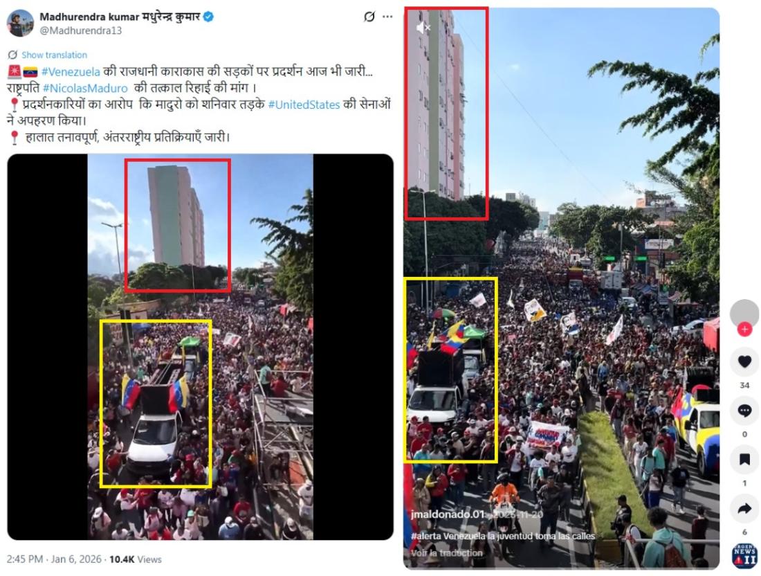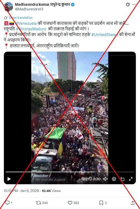 X पर एक यूज़र ने 6 जनवरी 2026 को वीडियो शेयर करते हुए लिखा, "वेनेज़ुएला की राजधानी काराकास की सड़कों पर प्रदर्शन आज भी जारी...राष्ट्रपति निकोलस मदुरो की तत्काल रिहाई की मांग".