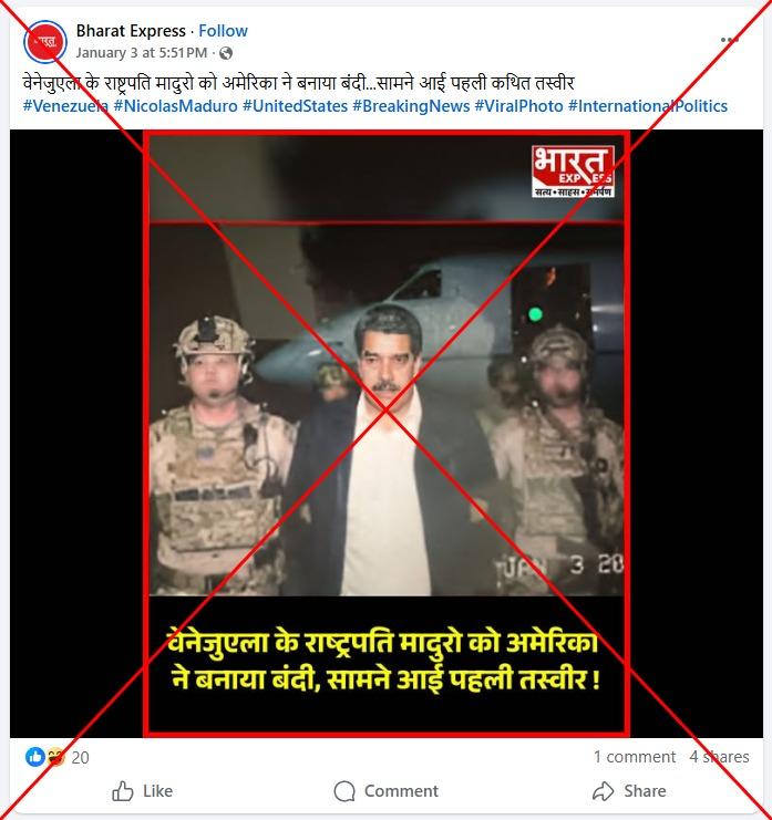 फ़ेसबुक पर 3 जनवरी, 2026 को एक पोस्ट में तस्वीर शेयर की गई है, जिसका कैप्शन है, "वेनेजुएला के राष्ट्रपति मादुरो को अमेरिका ने बनाया बंदी...सामने आई पहली कथित तस्वीर."