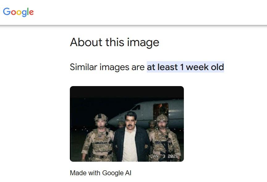 हालांकि, जिस तस्वीर में मदुरो को सुरक्षा बलों द्वारा ले जाते हुए दिखाया गया है, वह एआई द्वारा बनाई गई है.