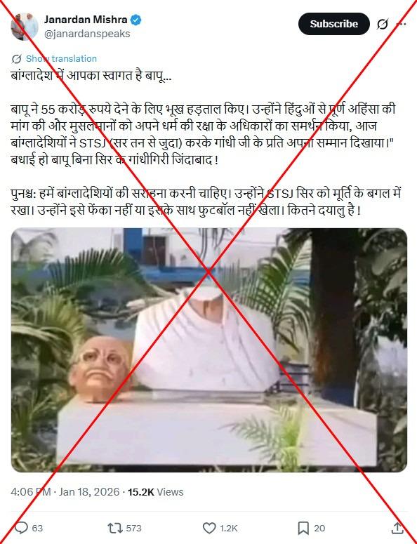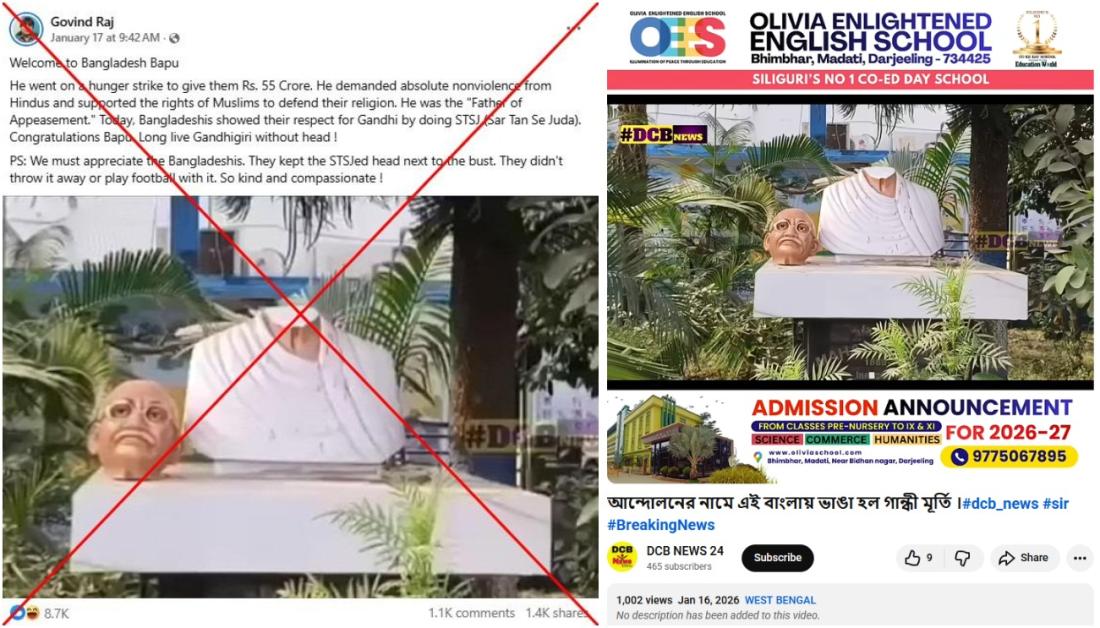 दिसंबर 2025 में बांग्लादेश के एक लोकप्रिय छात्र नेता की मृत्यु के बाद हुए विरोध प्रदर्शनों के दौरान सोशल मीडिया पर महात्मा गांधी की क्षतिग्रस्त प्रतिमा की एक तस्वीर इस गलत दावे के साथ शेयर की गई कि हिंसा के दौरान मूर्ति को नुकसान पहुंचाया गया था. हालांकि, तस्वीर पश्चिम बंगाल में एक सरकारी इमारत पर हुए हमले की है. यह इमारत राष्ट्रीय चुनाव निकाय द्वारा इस वर्ष होने वाले बंगाल चुनाव से पहले मतदाता सूची संशोधन के विरोध में हुए प्रदर्शन के दौरान क्षतिग्रस्त हुई थी.