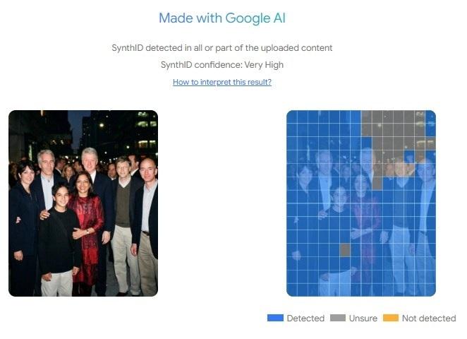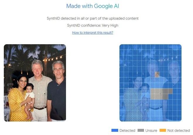 एआई-जनरेटेड कंटेंट की पहचान करने के लिए डिज़ाइन किए गए टूल, SynthID detector के साथ आगे के विश्लेषण से यह पुष्टि हुई कि इन तस्वीरों को एआई टूल का उपयोग करके बनाया गया था (आर्काइव्ड लिंक).