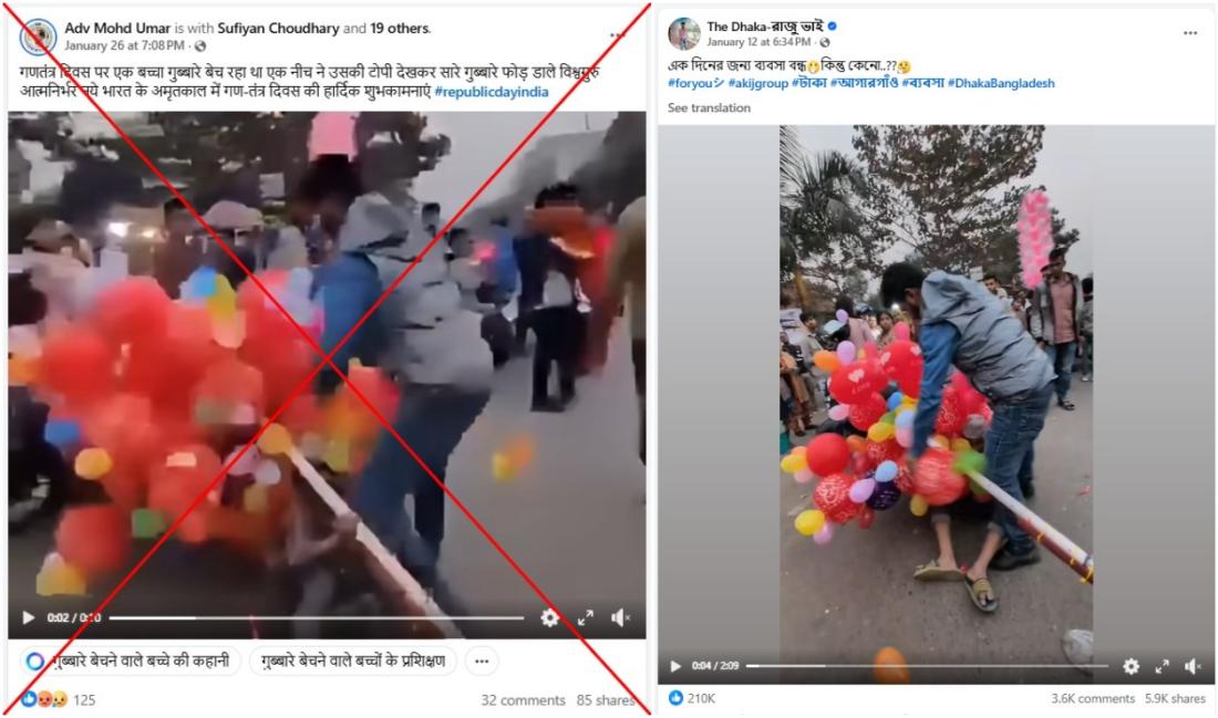 एक व्यक्ति सड़क पर बैलून बेच रहे बच्चे के सभी गुब्बारे फोड़ देता है. बच्चा गिड़गिड़ाता रहता है मगर वो एक नहीं सुनता. सोशल मीडिया पर इस वीडियो को शेयर करते हुए यूज़र्स ने दावा किया कि ये भारत में मुस्लिमों के खिलाफ़ हो रही हिंसा का एक उदहारण है मगर वीडियो बनाने वाले बांग्लादेश के कंटेंट क्रिएटर ने एएफ़पी को बताया कि यह एक "स्क्रिप्टेड" सीन था, और वीडियो में दिख रहा बच्चा पहले से जानता था कि क्या होने वाला है.