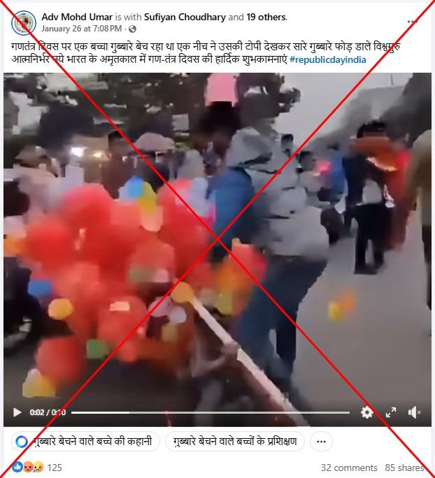 फ़ेसबुक पर 26 जनवरी, 2026 को शेयर किये गए वीडियो का कैप्शन है, "गणतंत्र दिवस पर एक बच्चा गुब्बारे बेच रहा था एक नीच ने उसकी टोपी देखकर सारे गुब्बारे फोड़ डाले."