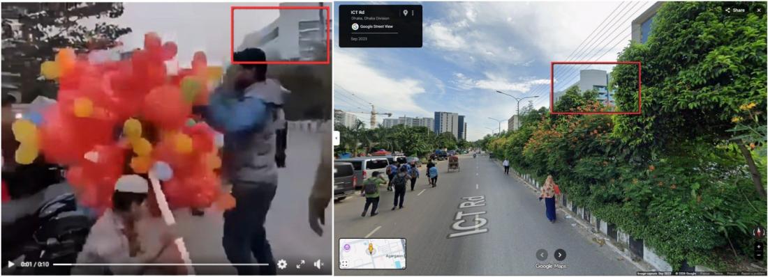 वीडियो में दिख रही लोकेशन गूगल मैप्स स्ट्रीट व्यू इमेज में ढाका के अगरगांव इलाके के एक क्षेत्र से मेल खाती है (आर्काइव्ड लिंक).