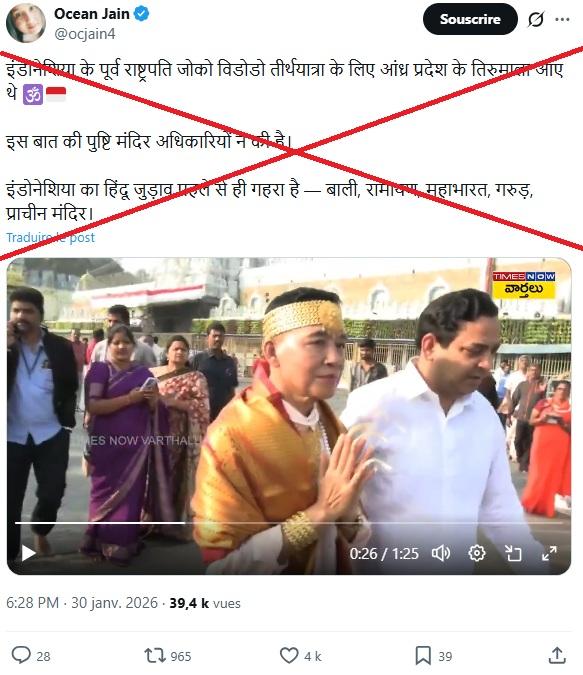 30 जनवरी 2026 को शेयर की गई एक X पोस्ट का कैप्शन है, "इंडोनेशिया के पूर्व राष्ट्रपति जोको विडोडो तीर्थयात्रा के लिए आंध्र प्रदेश के तिरुमाला आए थे."
