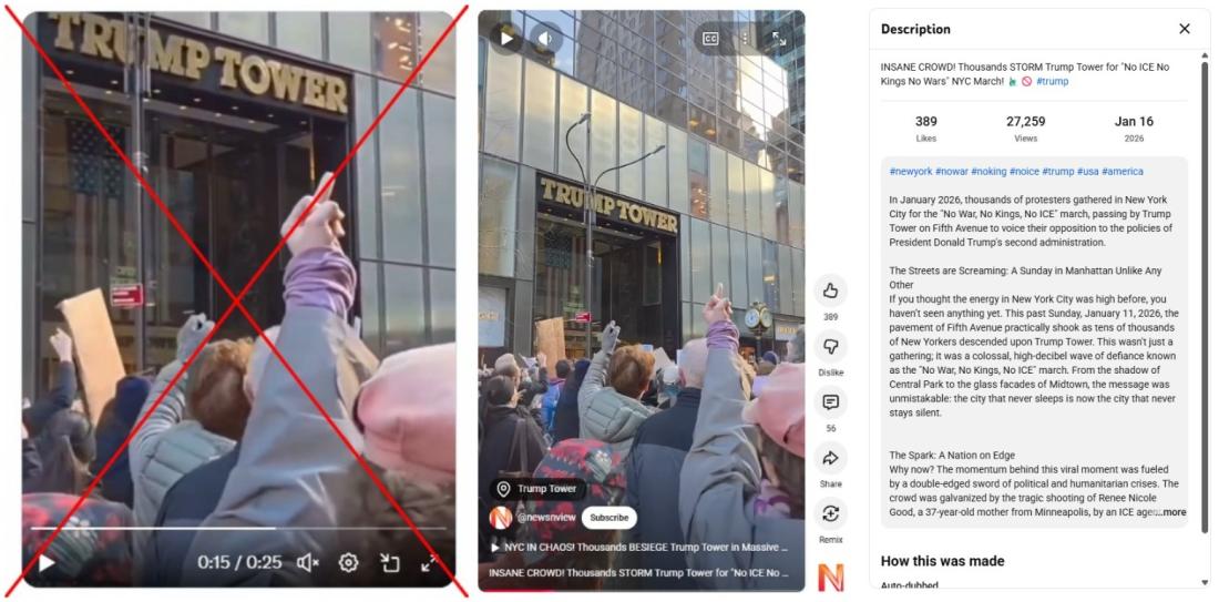 कैप्शन में लिखा है, "जबरदस्त भीड़! 'नो आईसीई, नो किंग्स, नो वॉर्स' न्यूयॉर्क सिटी मार्च के लिए हजारों लोग ट्रम्प टॉवर पर टूट पड़े!"