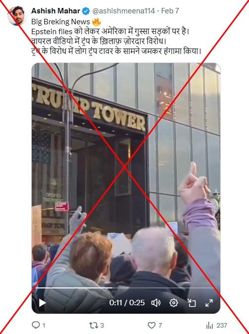 सोशल मीडिया साइट X पर 7 फ़रवरी, 2026 को शेयर किये गए एक वीडियो का कैप्शन है "Big Breaking News. Epstein files को लेकर अमेरिका में गुस्सा सड़कों पर है. वायरल वीडियो में ट्रंप के ख़िलाफ़ ज़ोरदार विरोध. ट्रंप के विरोध में लोग ट्रंप टावर के सामने जमकर हंगामा किया."