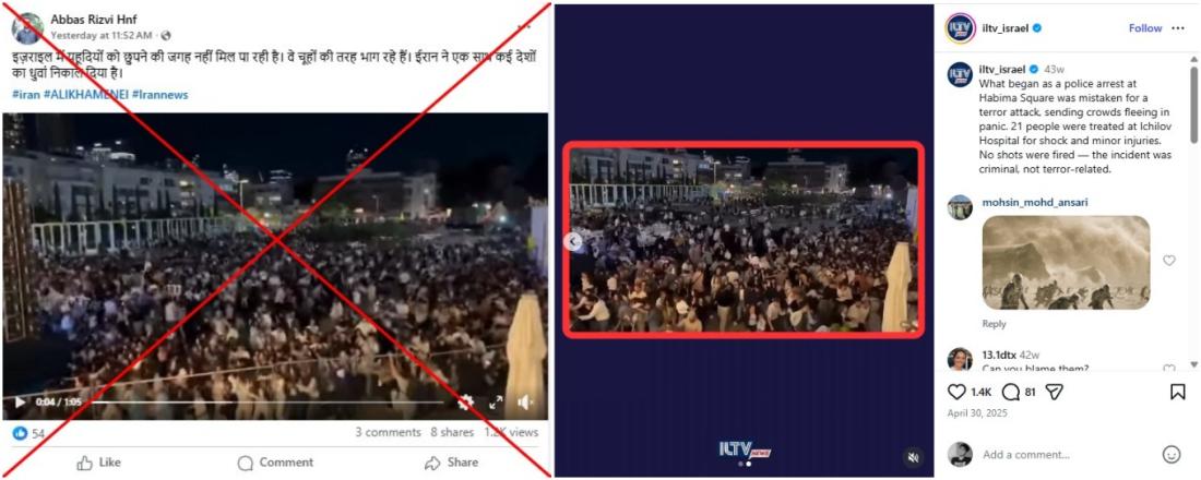 कैप्शन में लिखा है, "हबीमा स्क्वायर में पुलिस द्वारा की गई एक गिरफ़्तारी को आतंकवादी हमले के रूप में गलत समझ लिया गया, जिससे लोग घबराकर भागने लगे." हबीमा स्क्वायर तेल अवीव का एक प्रमुख सार्वजनिक स्थल है.