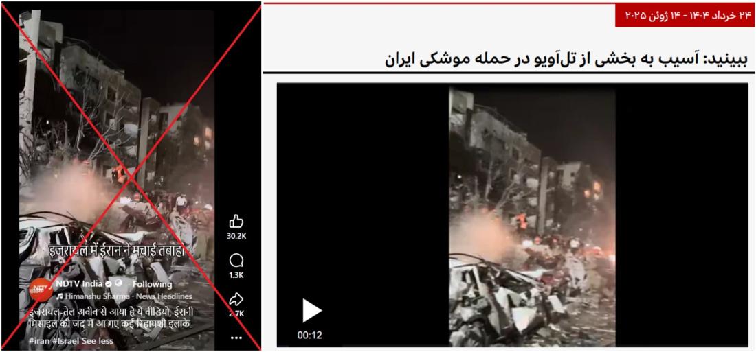 फ़ेसबुक पर न्यूज़ आउटलेट एनडीटीवी ने 1 मार्च को वीडियो शेयर करते हुए लिखा, "इज़रायल-तेल अवीव से आया है ये वीडियो, ईरानी मिसाइल की जद में आ गए कई रिहायशी इलाके."