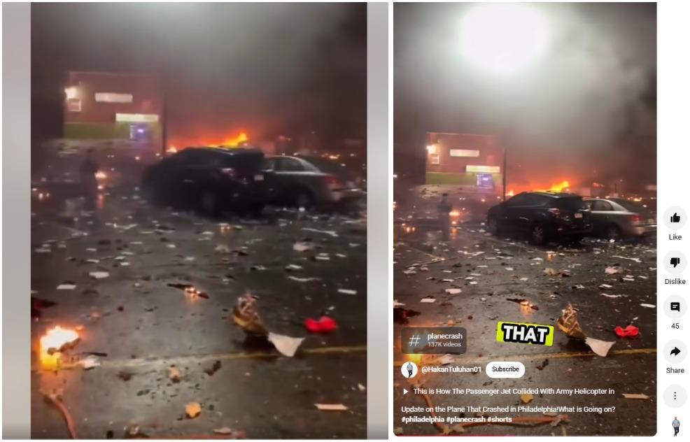 वीडियो के उपर बड़े अक्षरों में लिखा था: "फ़िलाडेल्फ़िया में विमान दुर्घटना".
