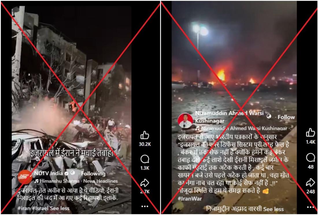 ईरान ने फ़रवरी 2026 में अपने सुप्रीम लीडर आयतुल्लाह अली खामेनेई की हत्या के बदले में US-इज़रायल के जॉइंट ऑपरेशन के खिलाफ़ इज़रायल पर कई मिसाइलें दागी हैं. इससे जोड़कर सोशल मीडिया पर कई भ्रामक तस्वीरें और वीडियो भी शेयर किये जा रहे हैं. इसी तरह दो वीडियो शेयर करते हुए दावा किया जा रहा है कि वे ईरान के मिसाइल हमले के बाद तेल अवीव में फैली अफ़रा-तफ़री और रिहायशी इलाकों में हुए विध्वंस को दिखाते हैं. जबकि दोनो वीडियो पुराने और असंबंधित हैं. एक वीडियो तेल अवीव पर ईरान के 2025 में किये हमले के बाद का है जबकि दूसरा वीडियो फ़िलाडेल्फ़िया में हुए एक प्लेन क्रैश की घटना का है.