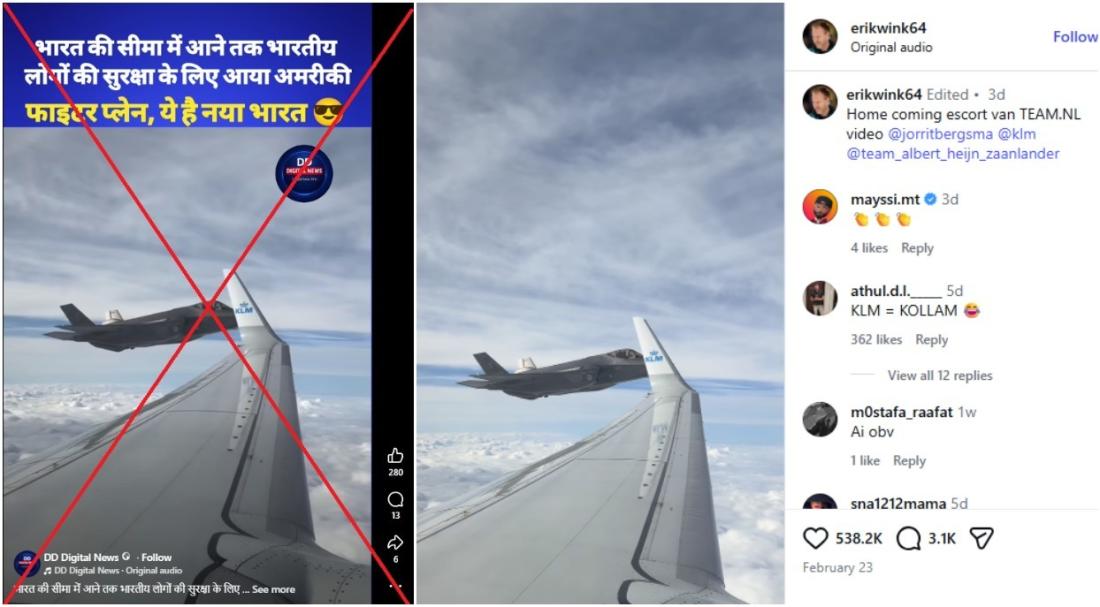 पश्चिम एशिया में चल रही जंग का असर दुनियाभर की उड़ानों पर पड़ा है. ईरान ने कई खाड़ी देशों पर मिसाइल हमले किए हैं, जहां अमेरिका के सैन्य ठिकाने हैं. लेकिन अमेरिकी सैन्य विमान द्वारा भारत जाने वाली यात्री उड़ान को एस्कॉर्ट करने के दावे से सोशल मीडिया पर शेयर किया जा रहा वीडियो असल में पुराना है. यह फ़्लाइट विंटर ओलंपिक से डच खिलाड़ियों को उनके देश वापस ला रही थी. इस दौरान नीदरलैंड की एयर फ़ोर्स ने स्वागत के लिए लड़ाकू विमान भेजा था.
