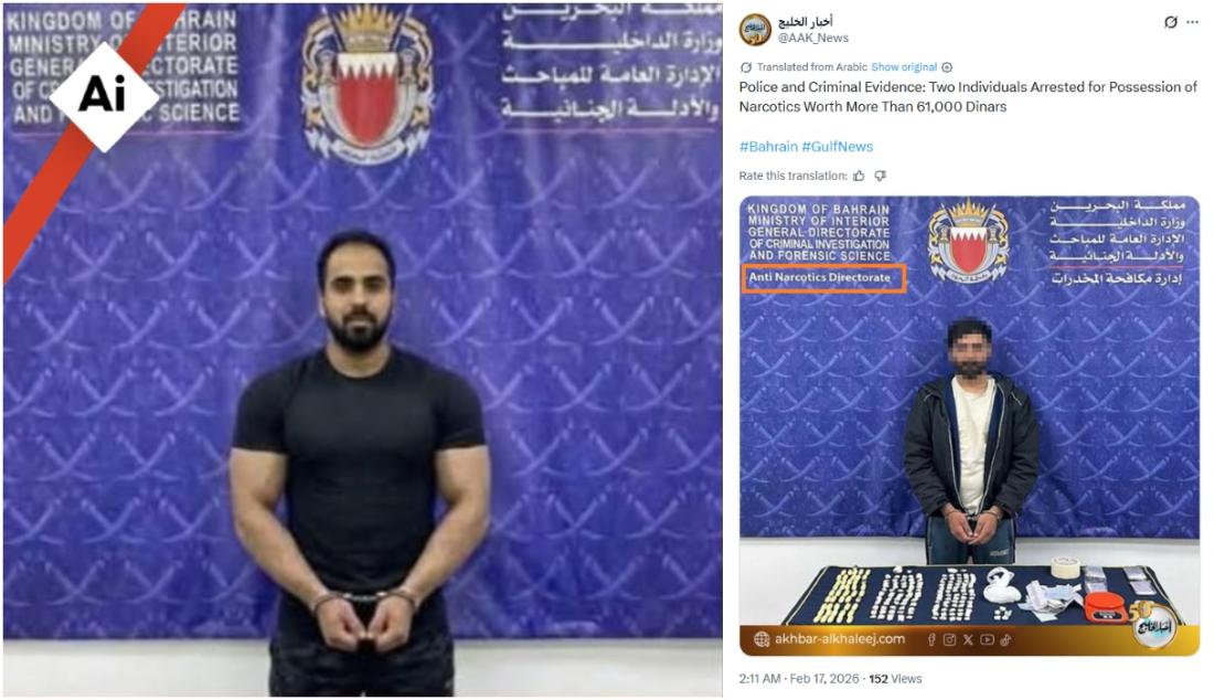 गूगल रिवर्स इमेज सर्च करने पर संदिग्ध आरोपियों की ऐसी ही तस्वीरें बहरीन के अखबारों द्वारा प्रकाशित मिलीं. ये खबरें ड्रग्स से जुड़े मामलों की थीं और इन तस्वीरों में नीले बैकग्राउंड पर “Anti Narcotics Directorate” लिखा दिखता है (आर्काइव्ड लिंक यहां, यहां, यहां).