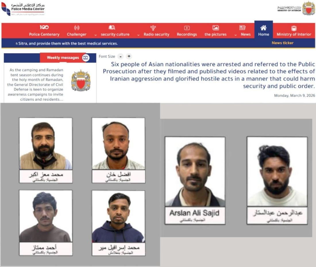 बहरीन के गृह मंत्रालय ने 8 मार्च को एक X पोस्ट में कहा कि जो लोग अहम जगहों की तस्वीरें सोशल मीडिया पर डालते हैं, वे ईरान के हमलों में मददगार माने जाएंगे और उन पर कार्रवाई होगी (आर्काइव्ड लिंक).