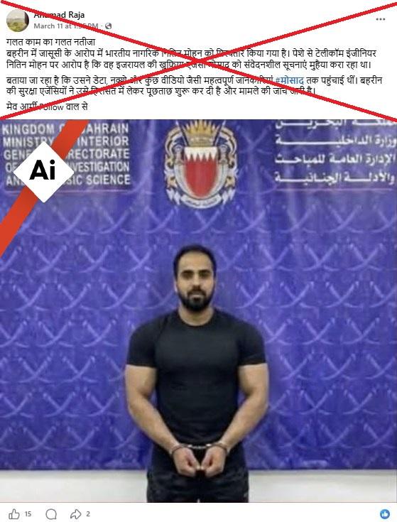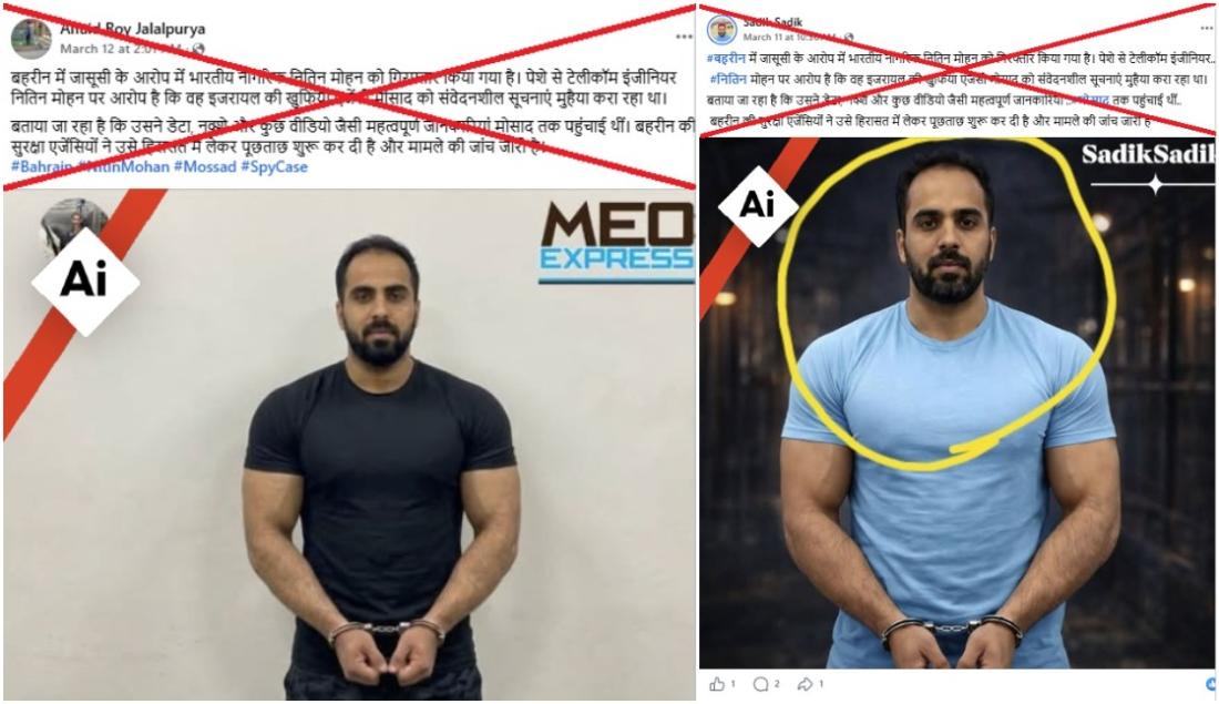 फ़ेसबुक पर 10 मार्च 2026 को पोस्ट की गई तस्वीर का कैप्शन है: "बहरीन में जासूसी के आरोप में भारतीय नागरिक नितिन मोहन को गिरफ्तार किया गया है. पेशे से टेलीकॉम इंजीनियर नितिन मोहन पर आरोप है कि वह इजरायल की खुफिया एजेंसी मोसाद को संवेदनशील सूचनाएं मुहैया करा रहा था."
