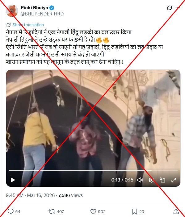 16 मार्च 2026 को X पर शेयर किए गए एक पोस्ट का कैप्शन है, "नेपाल में जिहादियों ने एक नेपाली हिंदू लड़की से बलात्कार किया. नेपाली हिंदुओं ने उन्हें सड़क पर फांसी दे दी."