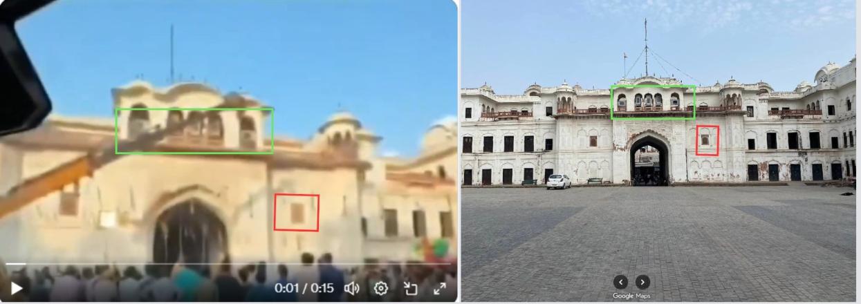वीडियो के कीफ़्रेम्स की मदद से गूगल पर रिवर्स इमेज सर्च करने पर पता चला कि वायरल वीडियो में दिख रहा मेहराब Google Maps Street View पर उपलब्ध पंजाब प्रांत में स्थित किला मुबारक की तस्वीरों से मेल खाता है (आर्काइव्ड लिंक).