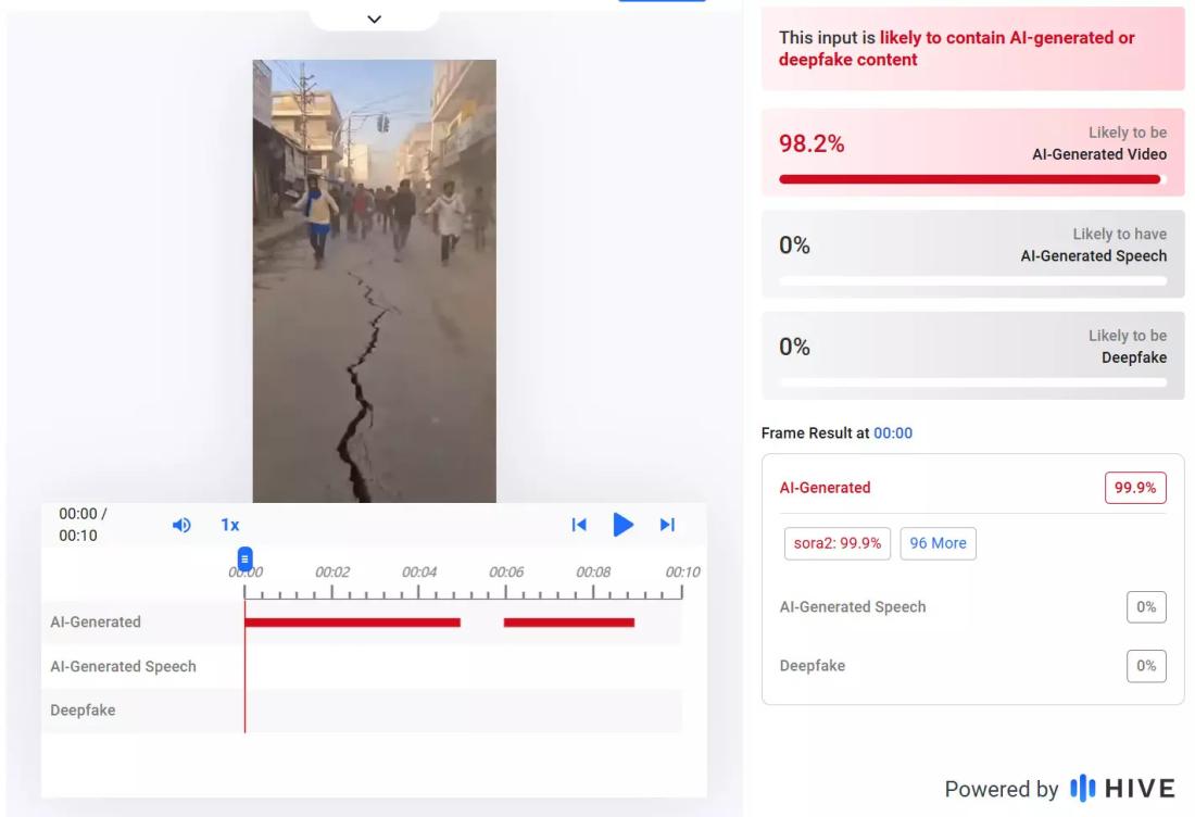 Hive Moderation के एआई डिटेक्शन टूल से किए गए विश्लेषण में पाया गया कि यह वीडियो "संभवतः एआई-जेनरेटेड या डीपफ़ेक कंटेंट" है (आर्काइव्ड लिंक).