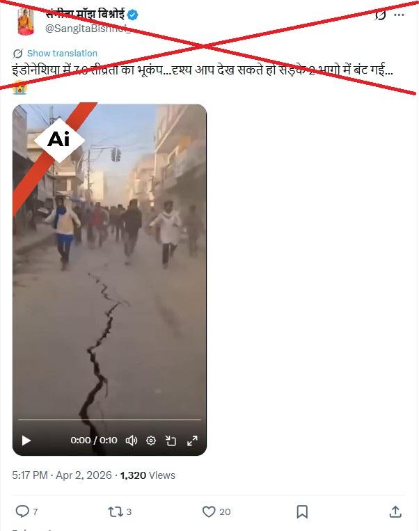 अप्रैल 2, 2026 को पूर्वी इंडोनेशिया के तट पर आए 7.4 तीव्रता के शक्तिशाली भूकंप के बाद भारत में सोशल मीडिया पर एक वीडियो शेयर कर दावा किया जाने लगा कि यह इंडोनेशिया में फैली अफरा-तफरी का दृश्य दिखाता है. हालांकि यह वीडियो एआई से बनाया गया है और जांच में इसमें कई ऐसी गलतियां मिलीं जो इसके एआई जेनरेटेड होने का सुबूत हैं.