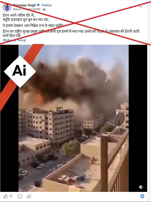 मार्च 31, 2026 को फ़ेसबुक पर शेयर किये गए वीडियो का कैप्शन है, "ईरान अपने अंतिम दौर में है क्योंकि इजरायल चुन-चुन करमार रहा है. ये हमला देखकर आप निश्चित रूप से सहम जायेंगे. ईरान का राष्ट्रीय सुरक्षा प्रमुख अली लारिजानी इसी हमले में मारा गया. हमले की तीव्रता से आसपास की ईरानी धरती मानो हिल गई."