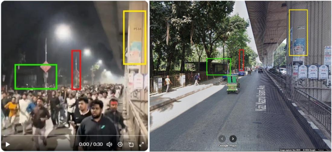 एएफ़पी ने क्लिप में दिख रहे खम्भों को गूगल मैप्स की स्ट्रीट इमेजरी से मिलाकर लोकेशन की पुष्टि की, जो शाहबाग के एक हाईवे से मेल खाती है (आर्काइव्ड लिंक).