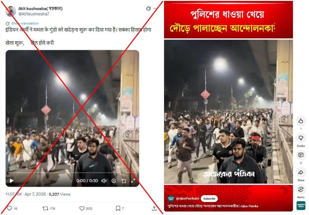 अप्रैल 2026 में होने वाले महत्वपूर्ण विधानसभा चुनावों की तैयारी के बीच सोशल मीडिया पर एक वीडियो शेयर हो रहा है जिसमें भीड़ भागती हुई दिखाई देती है और पीछे से धमाकों की आवाज़ आती है. दावा किया जा रहा है कि यह पश्चिम बंगाल में आर्मी द्वारा सत्ताधारी दल ऑल इंडिया तृणमूल कांग्रेस के समर्थकों को खदेड़ने का दृश्य है. हालांकि, यह वीडियो बांग्लादेश की राजधानी ढाका का है, जहां फ़रवरी में एक छात्र नेता की मौत के बाद विरोध प्रदर्शन हुए थे.