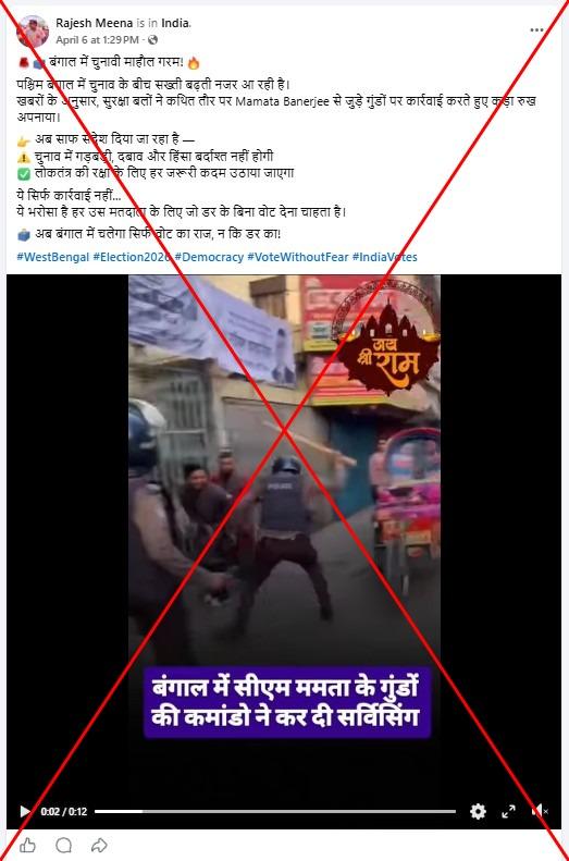 फ़ेसबुक पोस्ट में 6 अप्रैल को शेयर किये गए वीडियो का कैप्शन है, "बंगाल में चुनावी माहौल गरम! पश्चिम बंगाल में चुनाव के बीच सख्ती बढ़ती नजर आ रही है. खबरों के अनुसार, सुरक्षा बलों ने कथित तौर पर Mamata Banerjee से जुड़े गुंडों पर कार्रवाई करते हुए कड़ा रुख अपनाया."