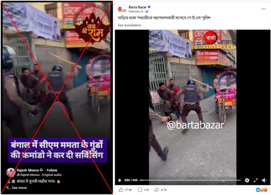 पश्चिम बंगाल में अप्रैल 2026 में होने वाले चुनावों की तैयारियों के बीच राजनीतिक पार्टियों के समर्थकों के बीच झड़पों की खबरें आई हैं, लेकिन ऑनलाइन शेयर हो रहा एक फ़ुटेज जिसमें दावा किया गया है कि ये पुलिस द्वारा तृणमूल कांग्रेस कार्यकर्ताओं को पीटते दिखाता है, असल में चुनावों से सम्बंधित नहीं है. यह वीडियो बांग्लादेश में कुछ महीने पहले एक युवा नेता की मौत की जांच की मांग को लेकर हुए प्रदर्शन के दौरान फ़िल्माया गया था.